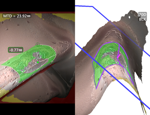 在發現并辨識損傷性質的基礎上,還可以利用單物鏡相位掃描三維立體測量(3DPM)技術精準測算損傷尺寸,以便孔探人員判斷是否符合適航要求。測量內容不限于傳統的裂紋長度、腐蝕面積等,還有多項專門針對航空孔探的測量內容,包括:對葉片掉角尺寸、葉尖卷邊角度、葉片損傷打磨弧度的半徑、以及葉尖與機匣間隙等進行測量。特別是觀察和測量可以使用同一個3DPM鏡頭、以及自動測量弧形葉面上的凹坑深度等,有助于提升孔探工作效率,特別是在航后孔探時間比較緊迫時,意義重大。
